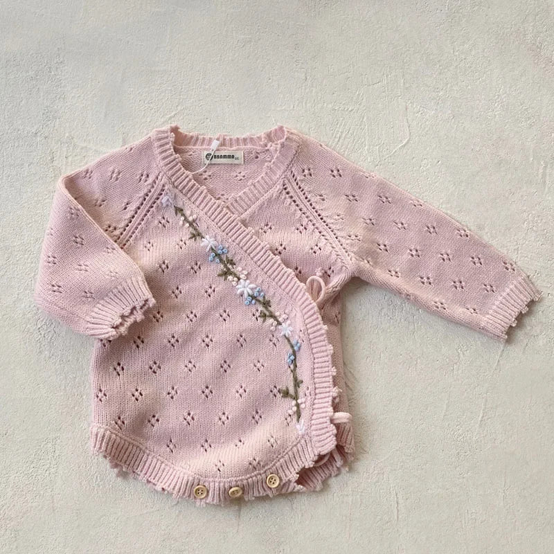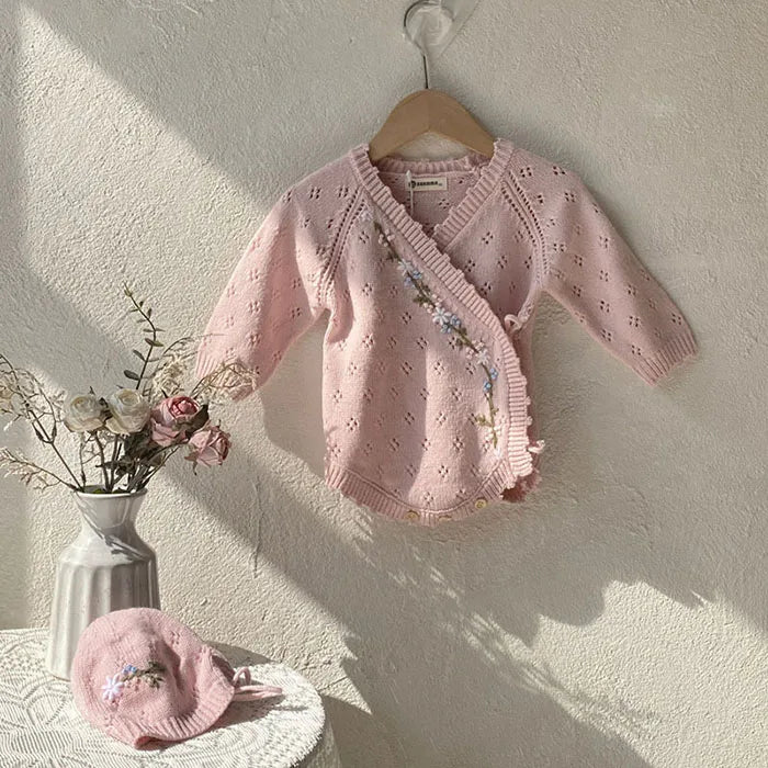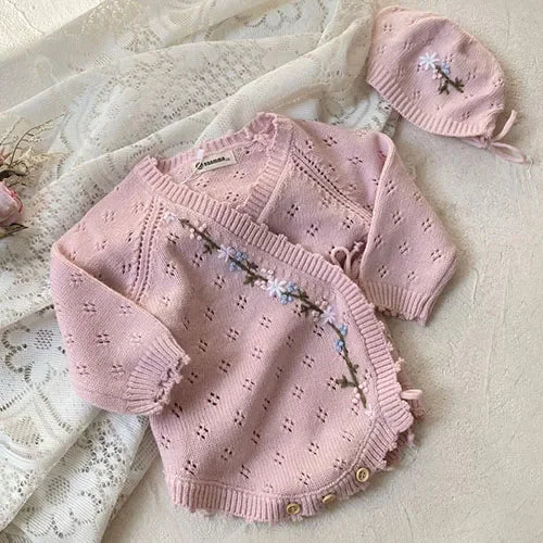 Unser Set mit wunderschöner Blumenverzierung ist genau das Richtige für dich! Dieser wunderschöne gestrickte Langarm Body und passender Mütze ist das perfekte Set für deine kleine Prinzessin und sorgt für zauberhafte Momente.